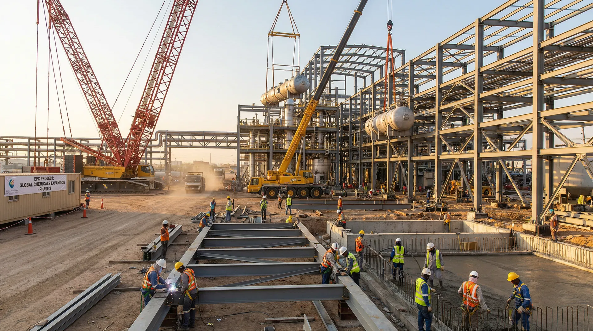 Construction will follow a modular approach with maximum pre-fabrication at SIL's in-situ fabrication yard (EIL-approved with best-in-class machinery). Piling will be accelerated by doubling the contractors. Peak construction manpower is estimated at 150–200 workers (RTC established, operating in shifts). Execution through heavy duty cranes, man-lifters and industrial machinery. Safety management will follow OHSAS 18001 standards with zero-incident targets.